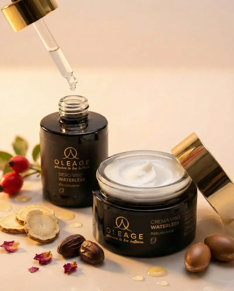 Scopri la Box Oleage Classic, la routine viso che unisce Crema Viso Classic Ristrutturante e Siero Viso Classic Ristrutturante, entrambi 100% waterless